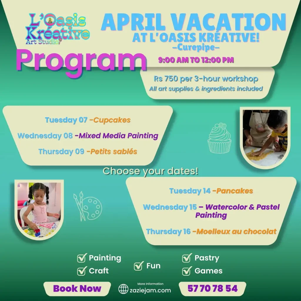 En janvier 2026, j’ai ouvert mon propre studio d’art pour les enfants, L’Oasis Kréative, à Curepipe : un espace dédié à l’éveil artistique et à la joie de créer.